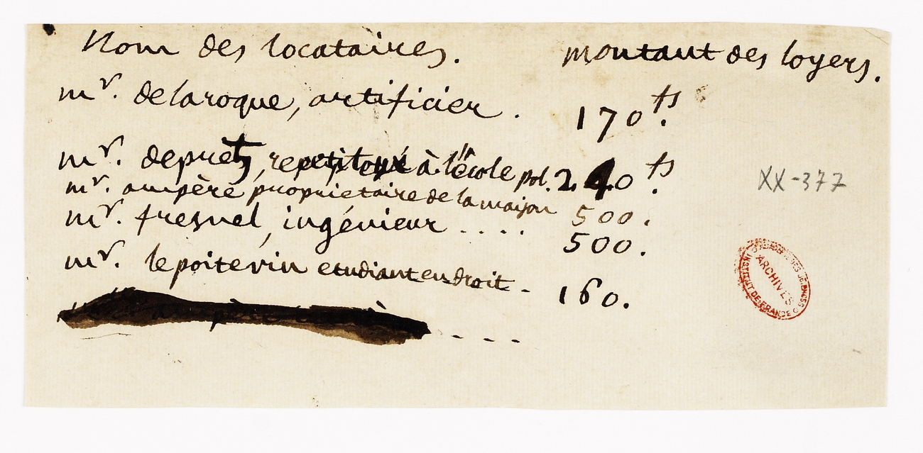 Sur ce papier non daté (années 1820), on reconnaît parmi ses locataires les noms de César Despretz (1791-1863), physicien et chimiste, futur professeur de physique à la Sorbonne, et du physicien Augustin Fresnel (1788-1827), célèbre pour avoir formulé la théorie ondulatoire de la lumière [page sur la physique], et avec qui Ampère entretint une amitié durable.