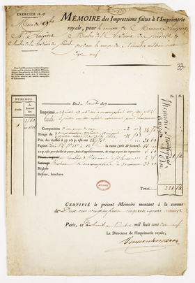 L’un des principaux postes de dépense du savant était probablement l’édition de ses nombreux mémoires ; on ne sait pas exactement ce qui était à sa charge mais ce genre de facture (ainsi que des allusions contenues dans des lettres) montre qu’il assumait lui-même une partie des frais.
