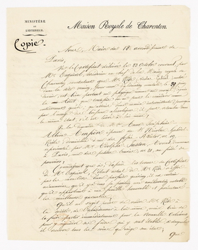 Copie : lettre du maire du 12e arrondissement* de Paris, ordonnant la sortie de Gabriel Ride de la Maison Royale de Charenton