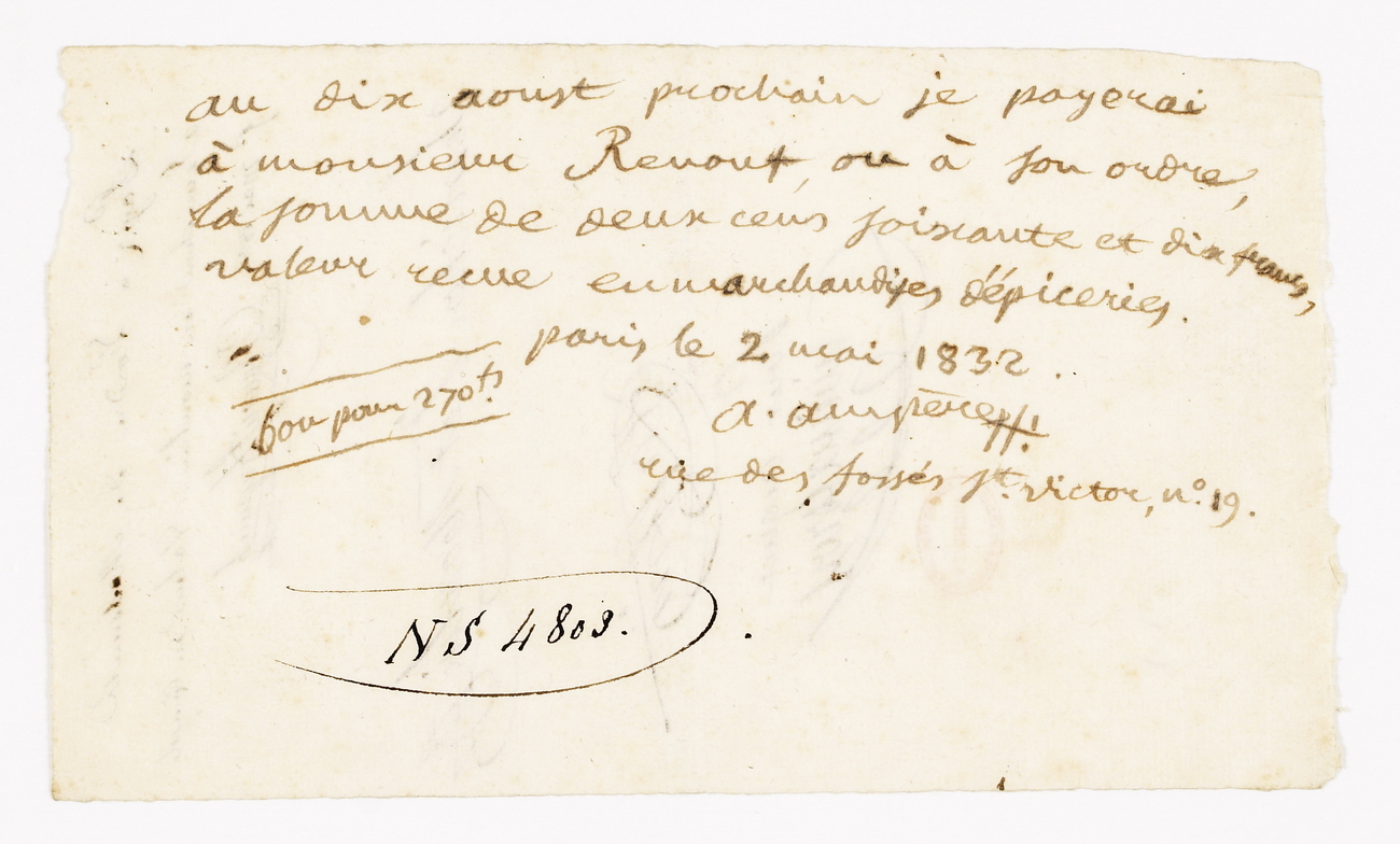 De nombreux billets et reçus comme celui-ci attestent de la situation financière souvent délicate du savant, à partir des années 1820.