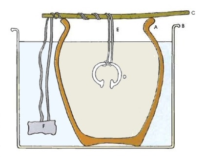 B : récipient contenant de l'acide sulfurique dilué à l'extérieur de la poterie